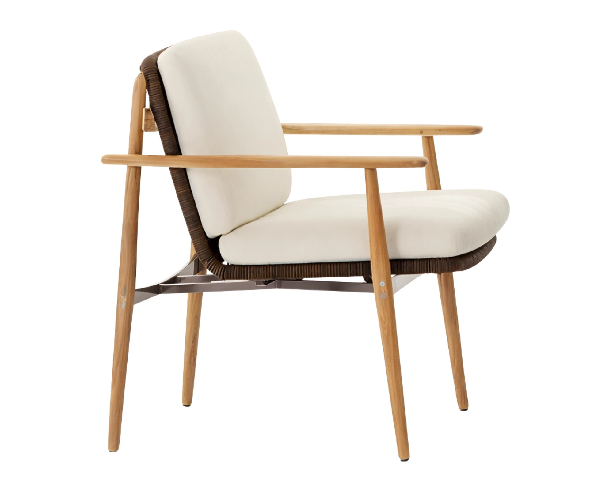 הידיות המעודנות והמעטפת הקלועה מוסיפות רובד עיצובי נוסף, ויוצרות תחושה אוורירית וקלילה המשתלבת בטבעיות עם הסביבה החיצונית. השילוב בין החומרים, הפרופורציות והגימור המוקפד מעניק לכיסא אופי יוקרתי ומאוזן.
