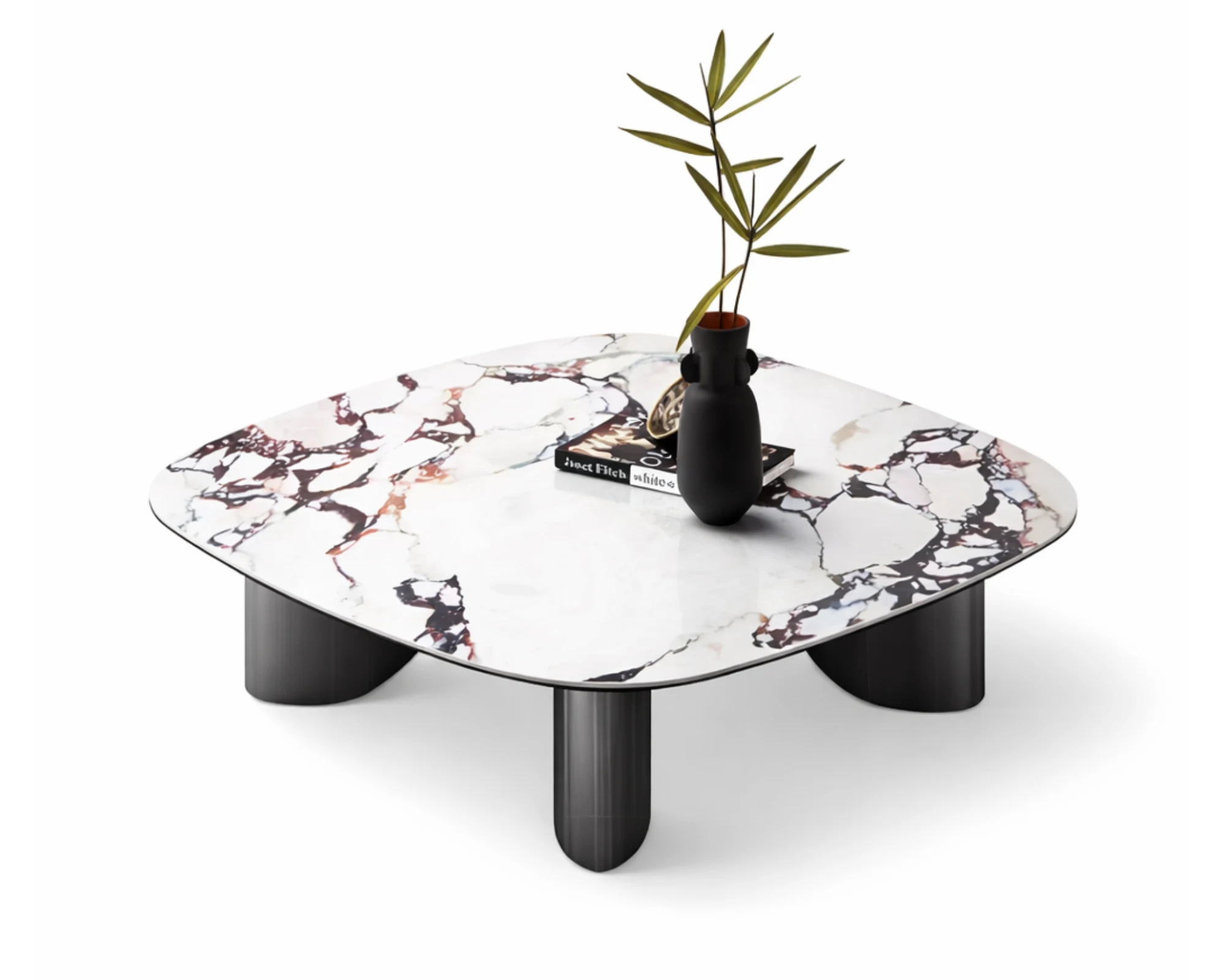 המשטח המרובע בעל הפינות המעוגלות עשוי אבן סינתטית איכותית המדמה טקסטורת שיש טבעי בגוונים עמוקים ודרמטיים, ומעניק תחושת יוקרה, עומק ותחכום. הרגליים העגולות והמאסיביות עשויות פלדת אל־חלד בגימור שחור, ומשלימות את המראה עם יציבות ונוכחות מודרנית אלגנטית.