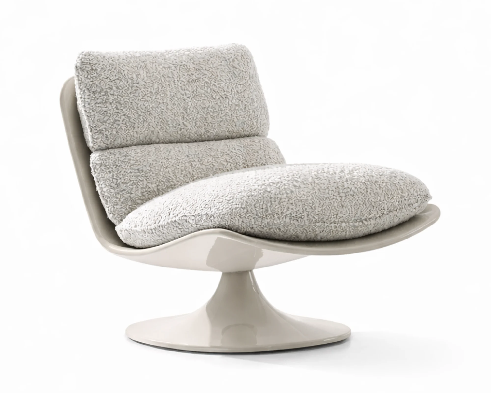 הבסיס המעוגל בצבע לבן מבריק מוסיף נגיעה של מודרניות נקייה, בעוד ריפוד הבד הרך במרקם עשיר מעניק מראה חמים, נעים ומזמין. כל פרט, מהתפרים המדויקים ועד הזוויות המאוזנות, משקף עבודת גימור מוקפדת ברמה גבוהה.