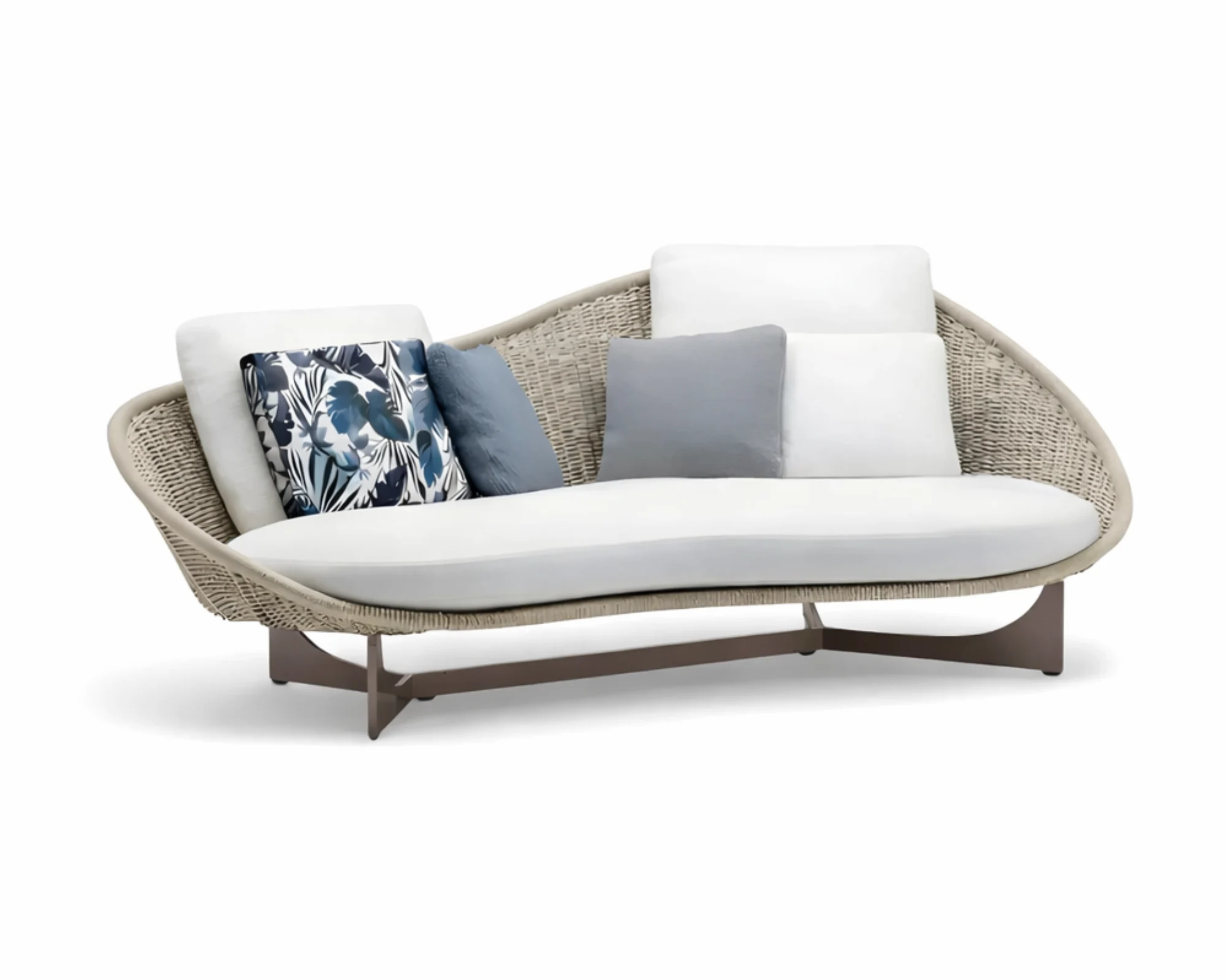 ספת חוץ בעיצוב עוטף מציגה קו מתעגל ורך, היוצר תחושת נוחות מרגיעה כבר מהרגע הראשון. המבנה הרחב והקווים הזורמים של המשענת מעניקים לה מראה חובק ואלגנטי, עם נוכחות שקטה ומדויקת.