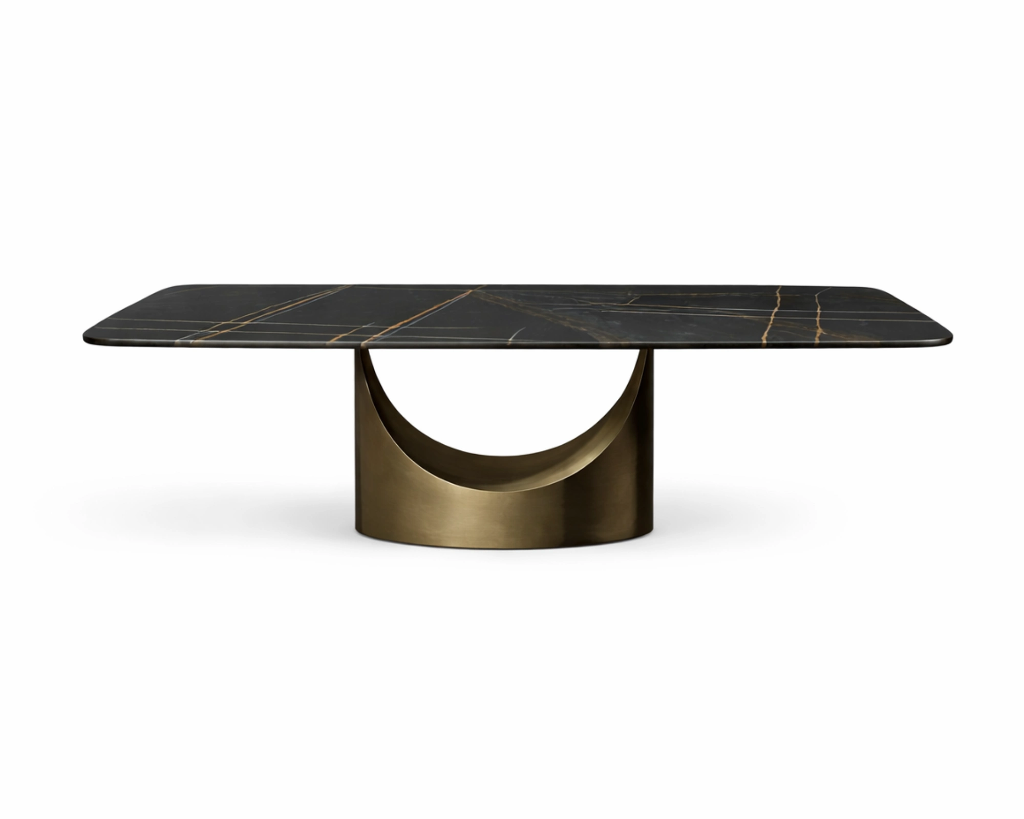 משטח השולחן עשוי שיש פורצלן איכותי, חומר יוקרתי בעל מראה אלגנטי ומעודן, המשתלב באופן טבעי בעיצוב הכללי. הרגל המעוצבת מנירוסטה מוברש מוסיפה נופך מודרני וייחודי, ויוצרת איזון מדויק בין חומריות מתקדמת למראה מעוצב.