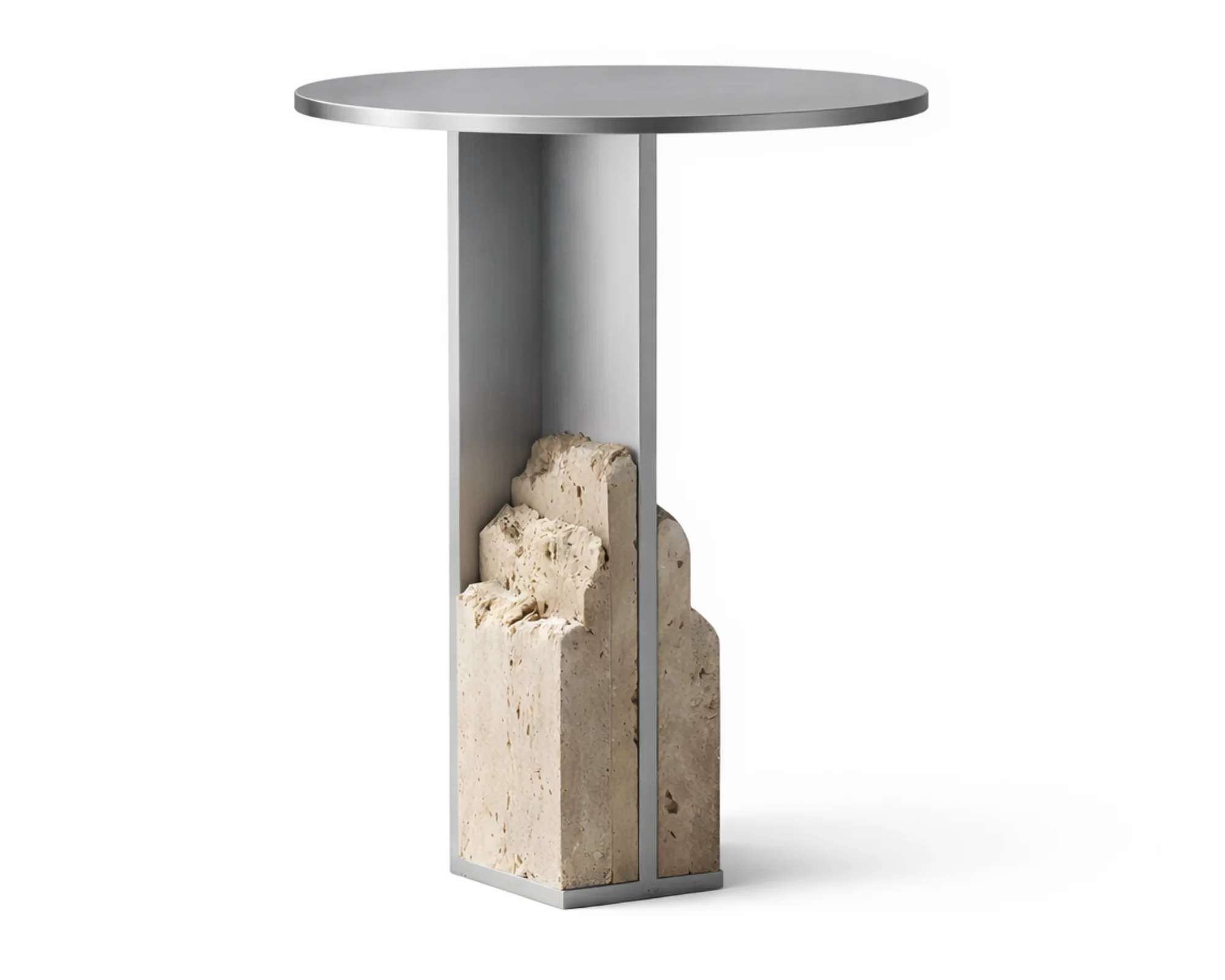 שולחן צד במרקם טבעי הוא פריט ייחודי שמחבר בין עולם החומר הגולמי לעיצוב מודרני מדויק. השילוב יוצא הדופן בין בסיס מינימליסטי מאלומיניום דקיק בגימור מט לבין אבן בגוון טבעי וגולמי יוצר ניגוד מרתק, שמוסיף עומק, אופי ונוכחות לחלל.