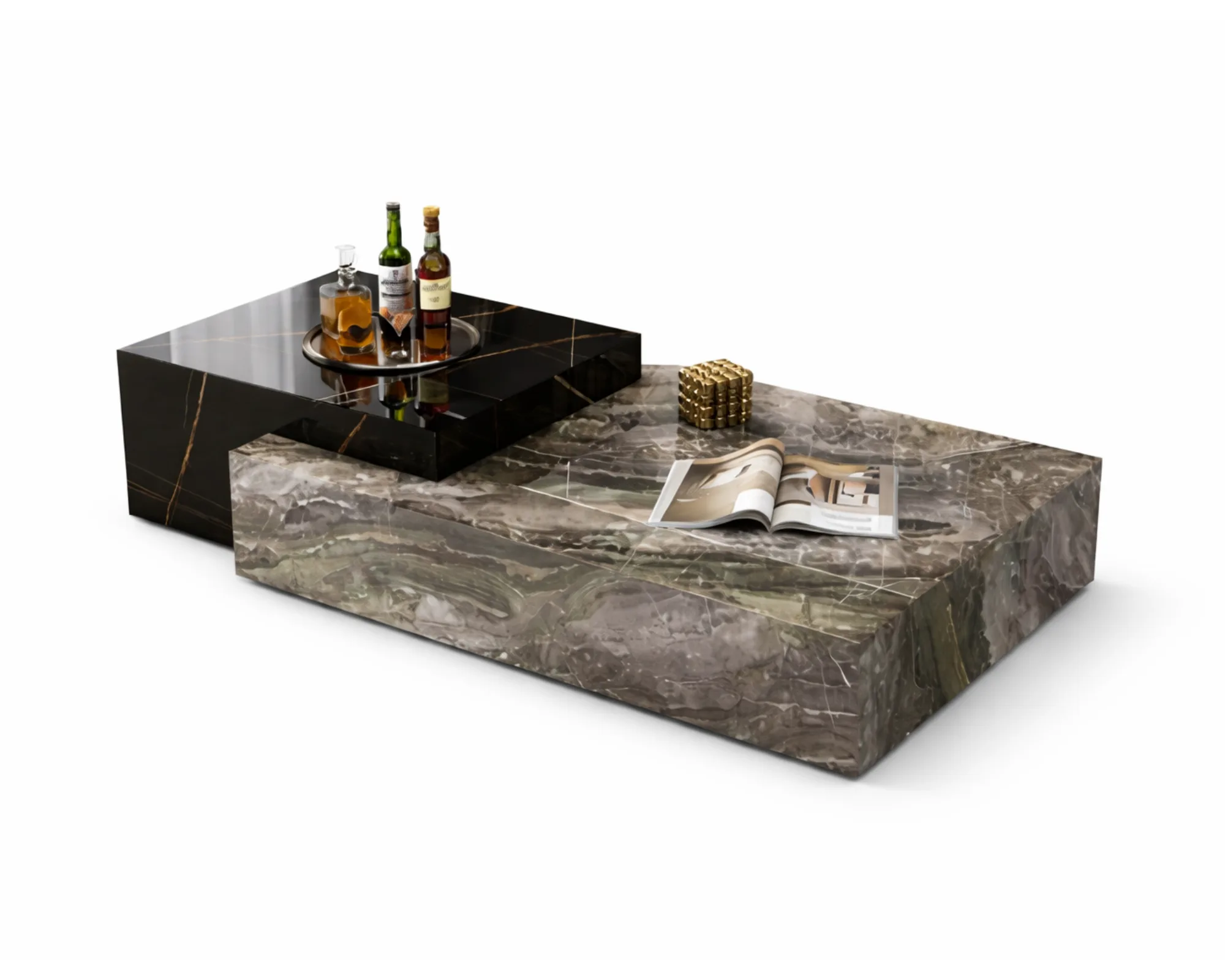 שולחן סלון בעיצוב מודרני מציג מראה פיסולי ונקי, עם נוכחות מרשימה ואלגנטית שמגדירה את חלל האירוח. העיצוב מבוסס על צורות גיאומטריות מדויקות ומראה אבן טבעית, היוצרים תחושת יציבות, עומק ויוקרה שקטה.