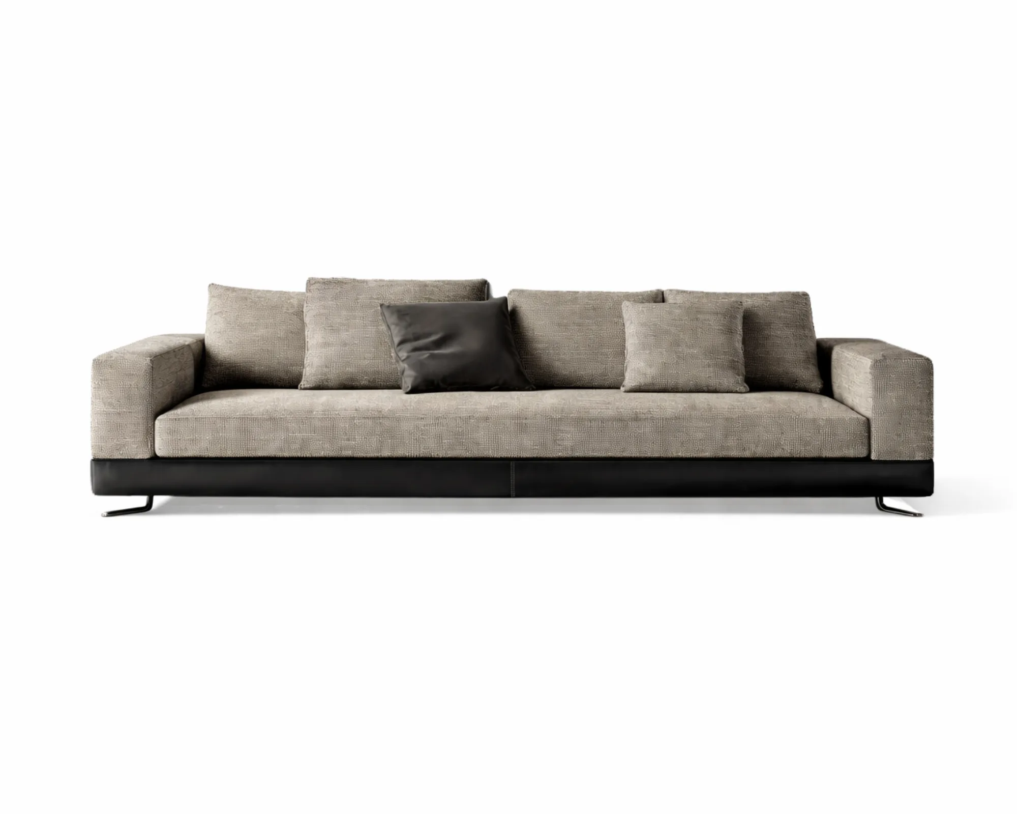 הרגליים המעוקלות, העשויות אלומיניום וטיטניום בגימור שחור, מוסיפות טאץ’ יוקרתי ומדגישות את הקו האלגנטי של הספה. זוהי ספה שנועדה להיות השקעה לטווח ארוך, פריט מרכזי בסלון המשלב חומרים איכותיים, עיצוב יוקרתי ונוחות נעימה הנשמרת לאורך שנים.