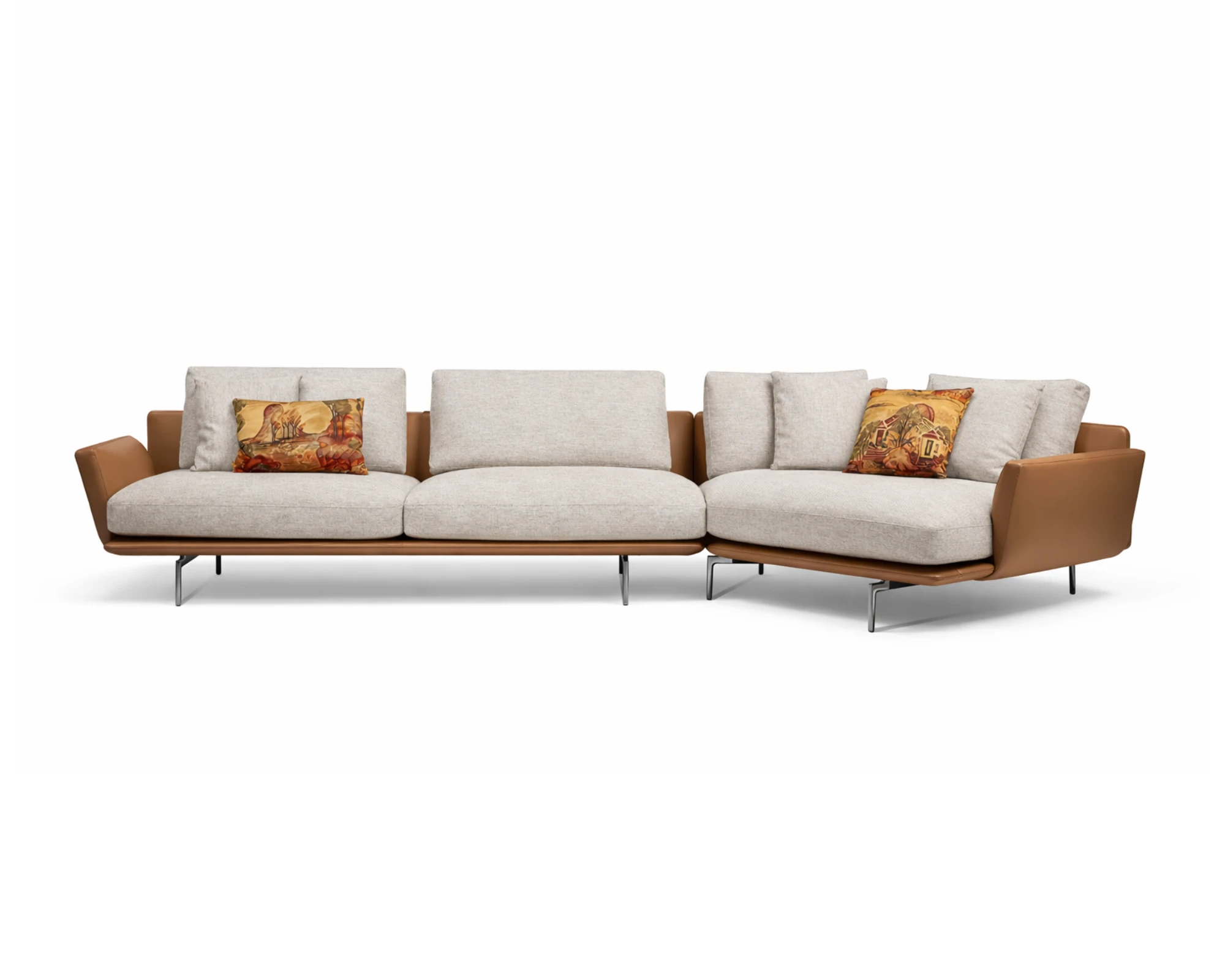 השזלונג משתלב כחלק טבעי מהעיצוב הכללי ומוסיף תחושת זרימה ורוך, תוך שמירה על קו עיצובי נקי ומוקפד. השילוב בין בד לעור או עור מלא מעניק לספה מראה עשיר ויוקרתי, ומדגיש את תשומת הלב לפרטים ולאיכות החומרים.