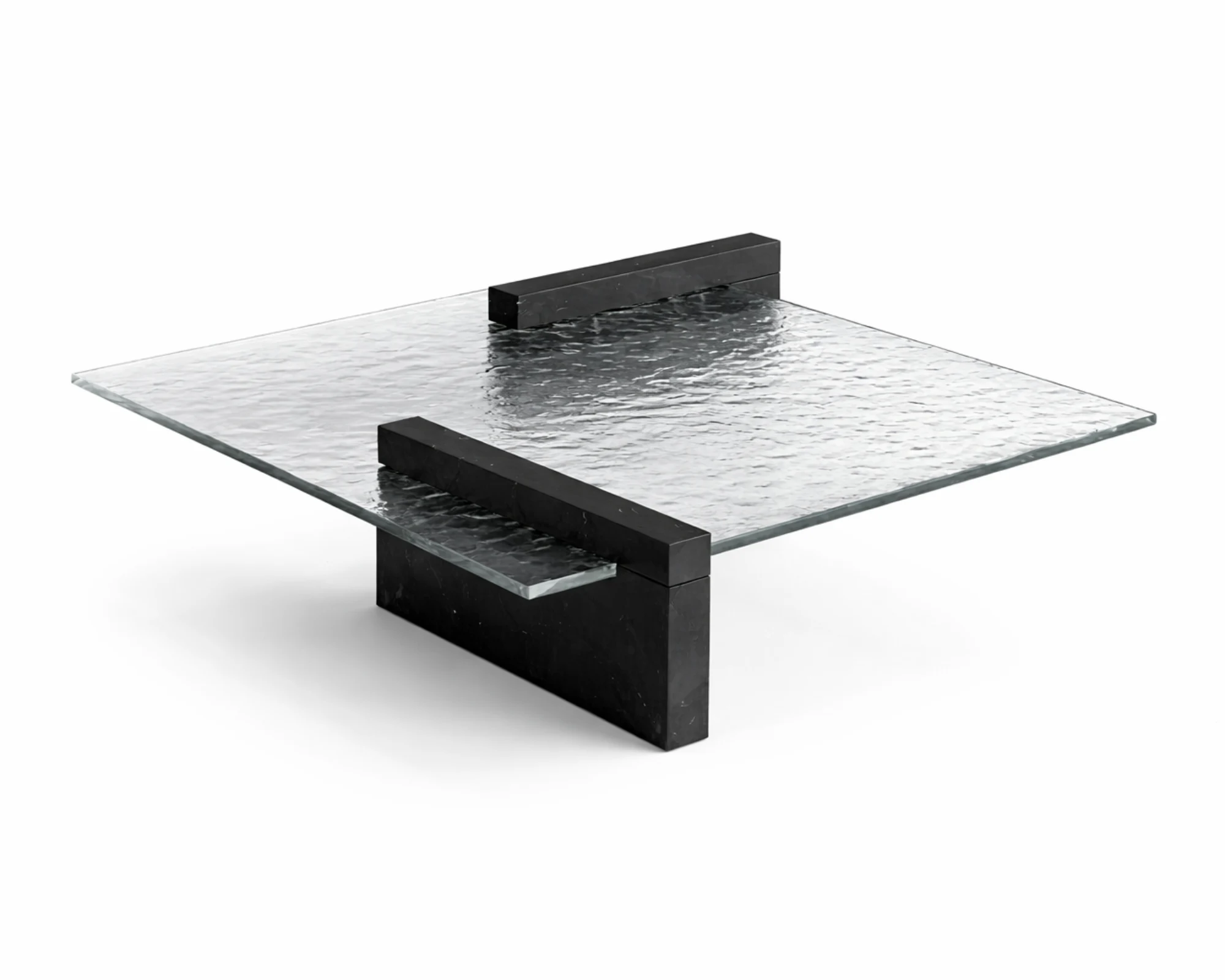 שולחן קפה מרובע בעיצוב עכשווי המשלב שקיפות אלגנטית עם נוכחות עיצובית עוצמתית ומדויקת. זהו פריט מרכזי שמעניק לחלל תחושת קלילות ופתיחות, לצד אמירה עיצובית ברורה ומודרנית.