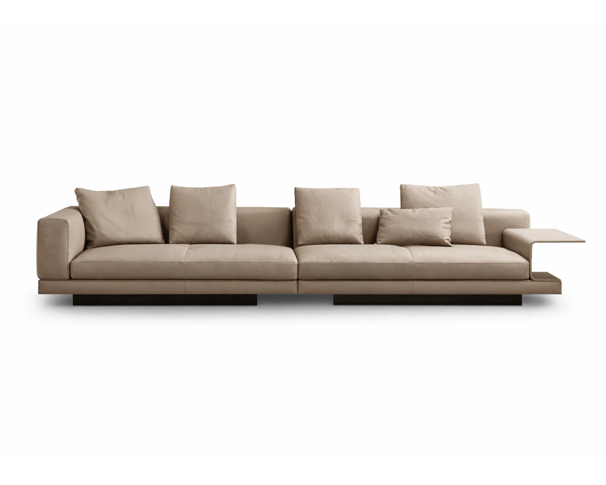משטח העבודה המשולב, העשוי פלטת פלדה מוצקה ומכוסה עור אוכף, משתלב כחלק אינטגרלי מהעיצוב ומוסיף אלמנט אלגנטי ופונקציונלי, מבלי לפגוע בניקיון הצורני של הספה. השילוב בין בד או דמוי עור יוקרתי מדגיש את האופי המוקפד ומעשיר את המראה הכללי.