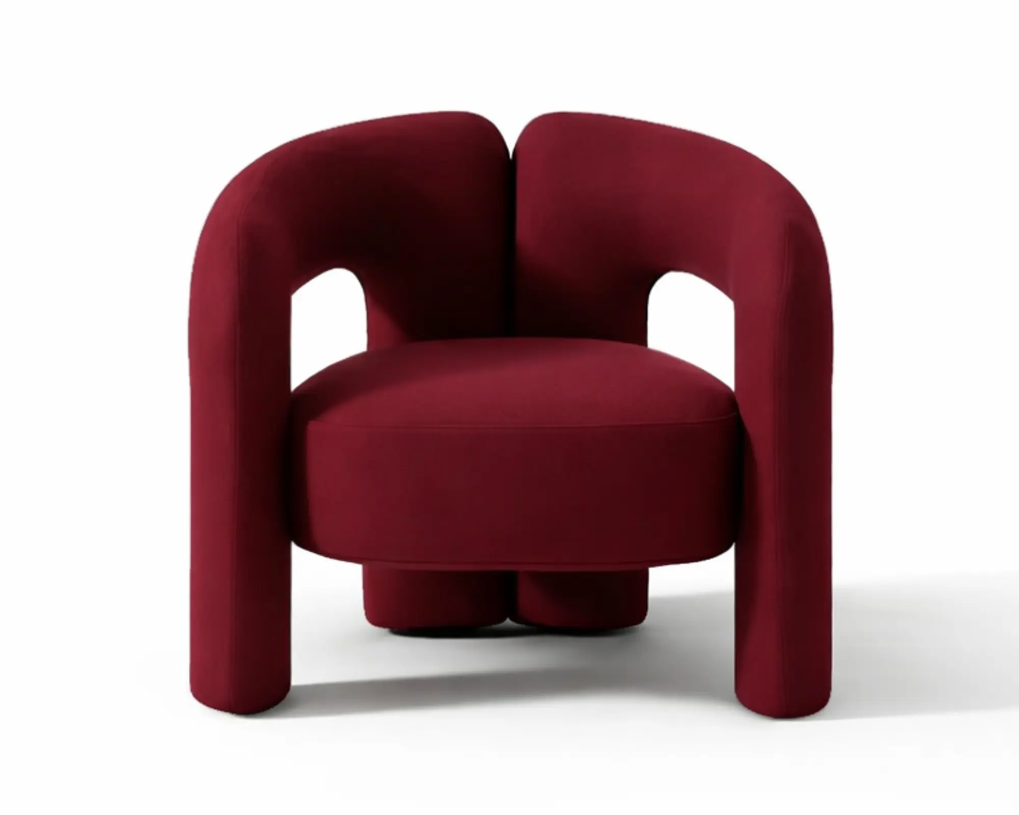 כורסא מעוצבת בגוון בורדו עמוק עם קווים מעוגלים ופיסוליים, היוצרים מראה ייחודי ומלא נוכחות. משענות היד המעוגלות והפתוחות בצדדים מעניקות תחושת אווריריות לצד מסגרת עוטפת ונוחה, והבסיס הגלילי המשתלב בתחתית משלים את העיצוב המודרני והנועז.