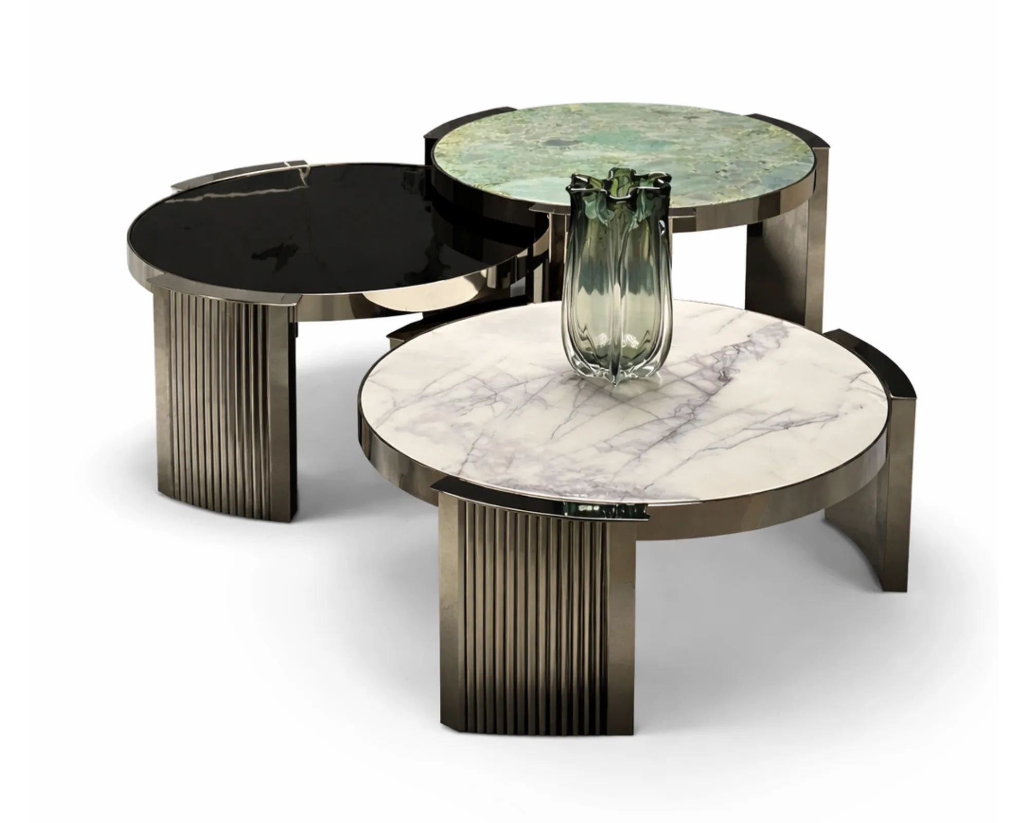 סט שולחנות שיש אלגנטיים בעיצוב עכשווי, המעניק לחלל הסלון מראה יוקרתי, מוקפד ובעל נוכחות עיצובית מרשימה. שלישיית השולחנות המעוגלים משתלבת בהרמוניה בכל סלון יוקרתי ויוצרת קומפוזיציה דינמית ומלאת עניין.