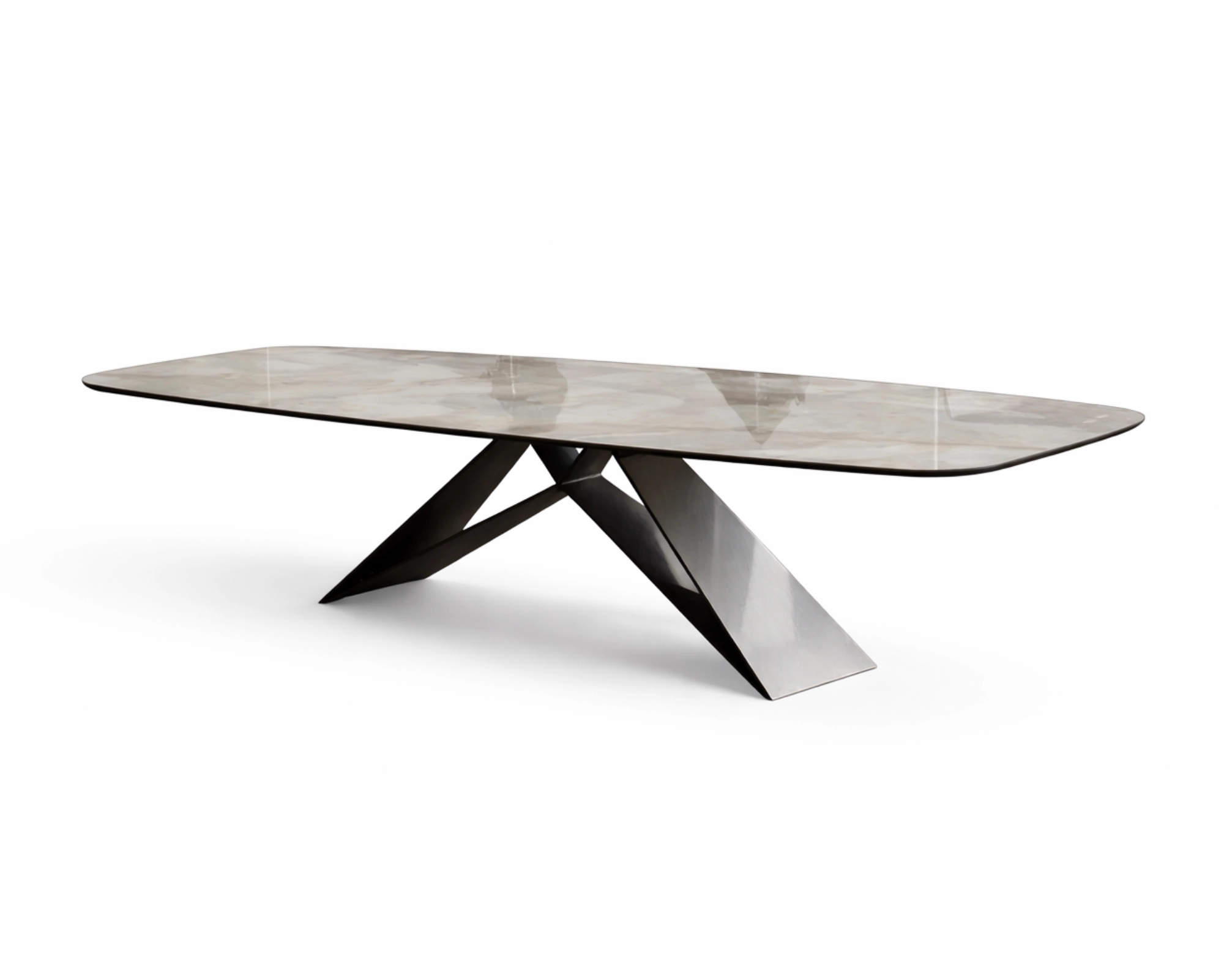 שולחן אוכל מעוצב עם רגלי נירוסטה מרשימות מוסיף לחלל האוכל טאץ' של סגנון יוקרתי ונוכחות אלגנטית. העיצוב המוקפד משלב קווים נקיים עם חומריות איכותית, ויוצר מראה מרשים ההופך את השולחן לפריט מרכזי ודומיננטי בחלל.