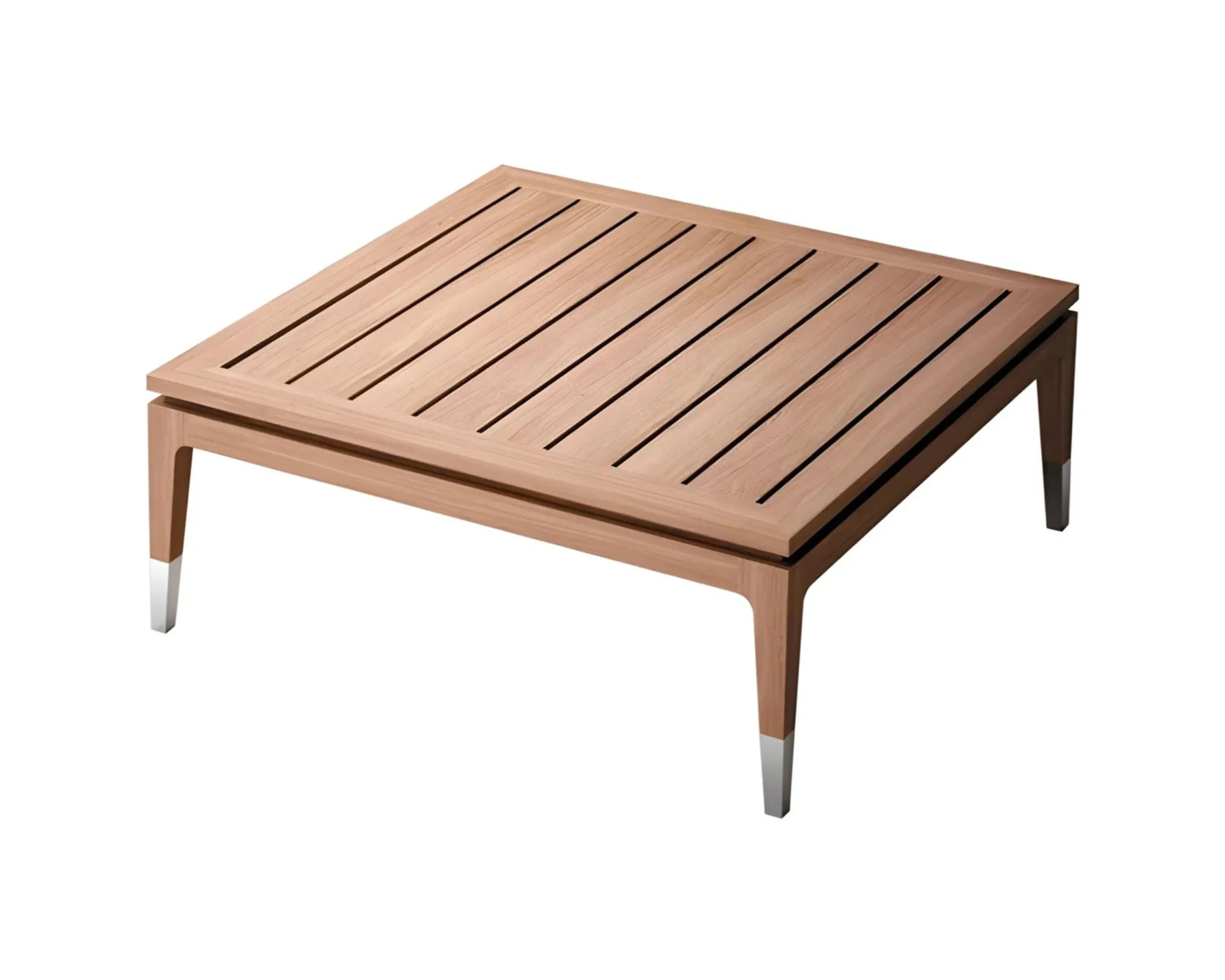 שולחן חוץ מרובע במראה עץ מציג עיצוב נקי ומאוזן עם נוכחות טבעית ואלגנטית. המשטח העליון המפוספס יוצר קצב עדין ועניין חזותי, תוך שמירה על שפה עיצובית רגועה ומוקפדת.