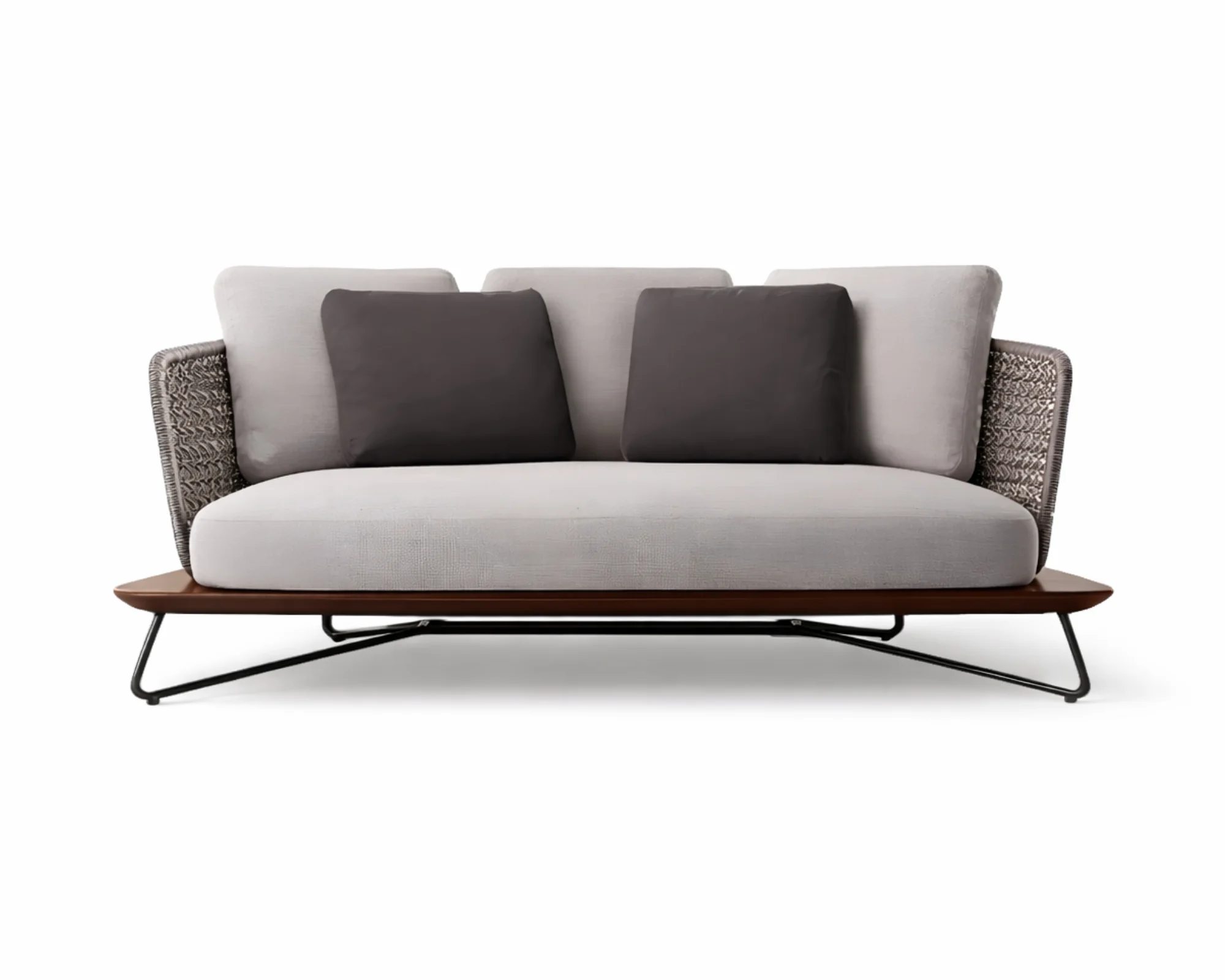 בסיס הספה עשוי עץ טיק בשילוב אלומיניום, משולב בספוג מחורץ ובריפוד המיועד לשימוש חוץ, עם אפשרות לבחירת בדים וגוונים נוספים ליצירת מראה מותאם והרמוני.
