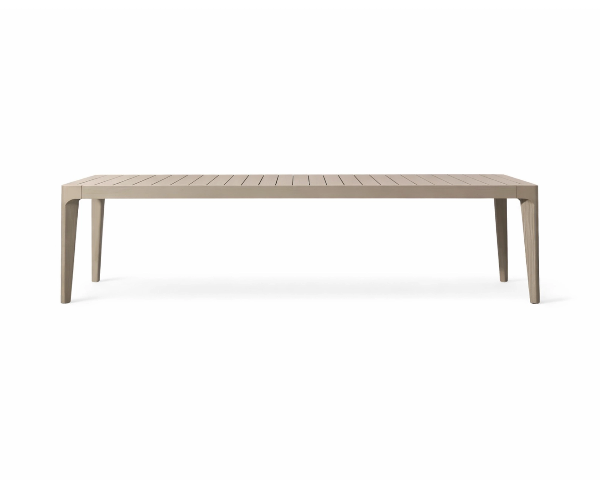 השולחן מציג מראה רחב ומרשים, כזה שמגדיר את החלל מבלי להכביד עליו. העיצוב שומר על שפה מודרנית רגועה, ומאפשר לו להשתלב בקלות בגינה, בחצר או במרפסת, לצד מגוון סגנונות ריהוט חוץ.