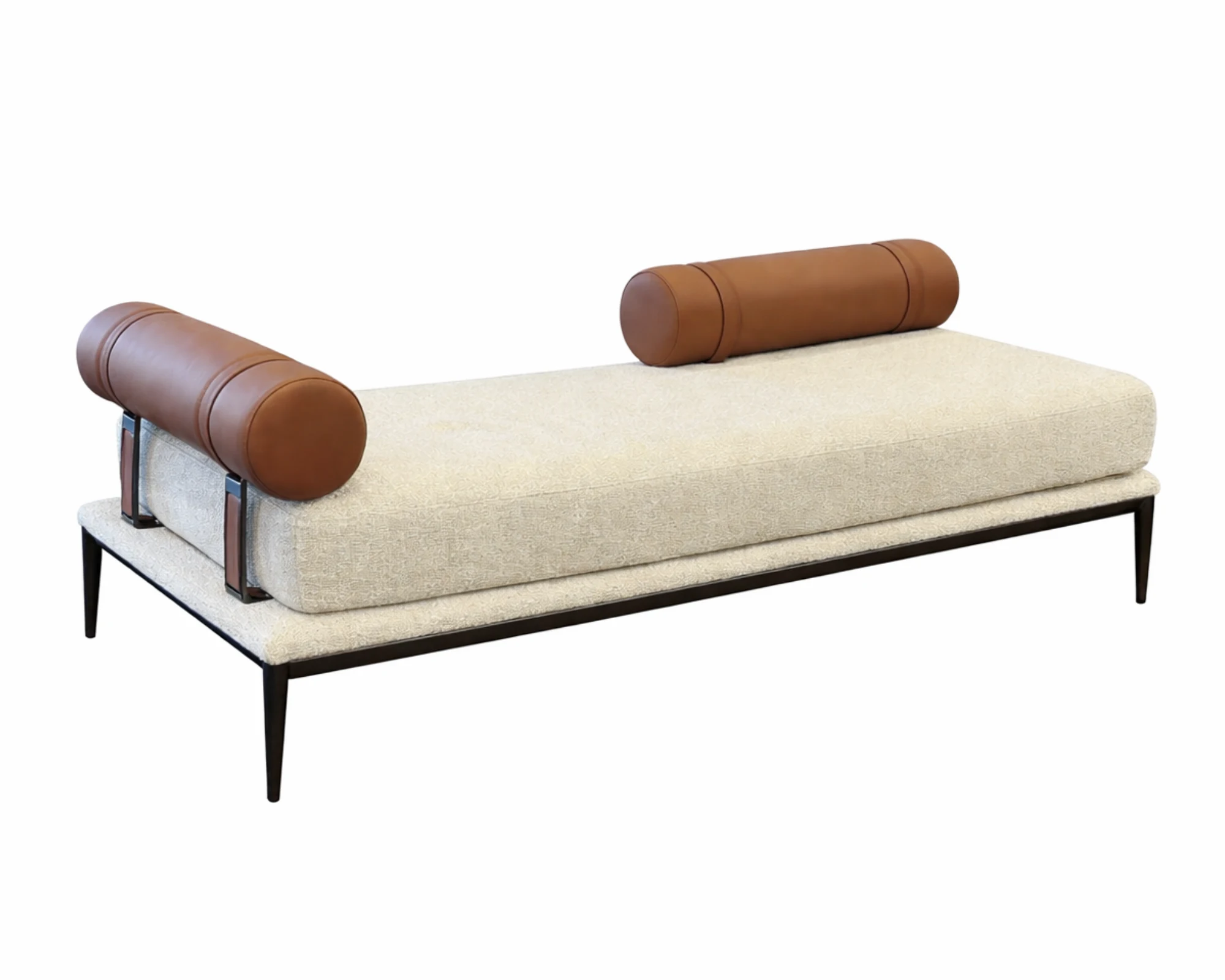 הקווים הישרים של גוף ההדום משתלבים עם מסגרת דקה ורגליים עדינות המעניקות לרהיט מראה קליל ומדויק. השילוב בין המושב המרופד לבין הכריות הגליליות יוצר קומפוזיציה מעניינת של צורות – משטח ישר ורחב לצד אלמנטים מעוגלים שמרככים את המראה הכללי.