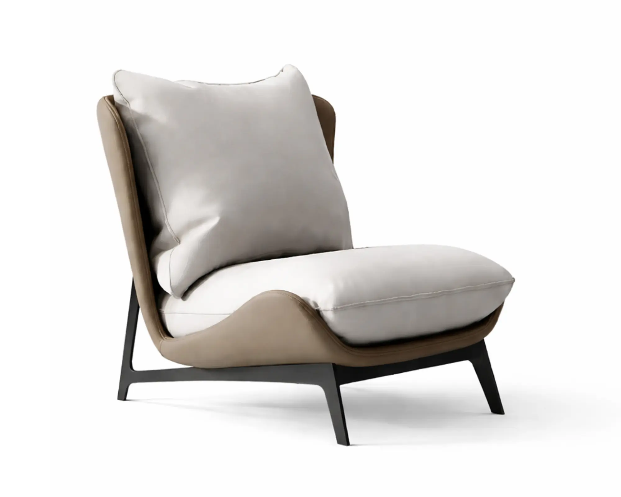הכורסא משלבת ריפוד דו-גוני ייחודי: מעטפת חיצונית בגוון חום-טאופ חמים המדגישה את צורתה האורגנית, ובפנים כריות רכות בגוון בהיר ונעים לעין המעניקות תחושת קלילות ורעננות לחלל. כרית הגב הגדולה והמושב הרחב מרופדים בספוג בצפיפות גבוהה, המספקים תמיכה מאוזנת ונוחות גבוהה לישיבה ממושכת, תוך שמירה על מראה מלא ועשיר.