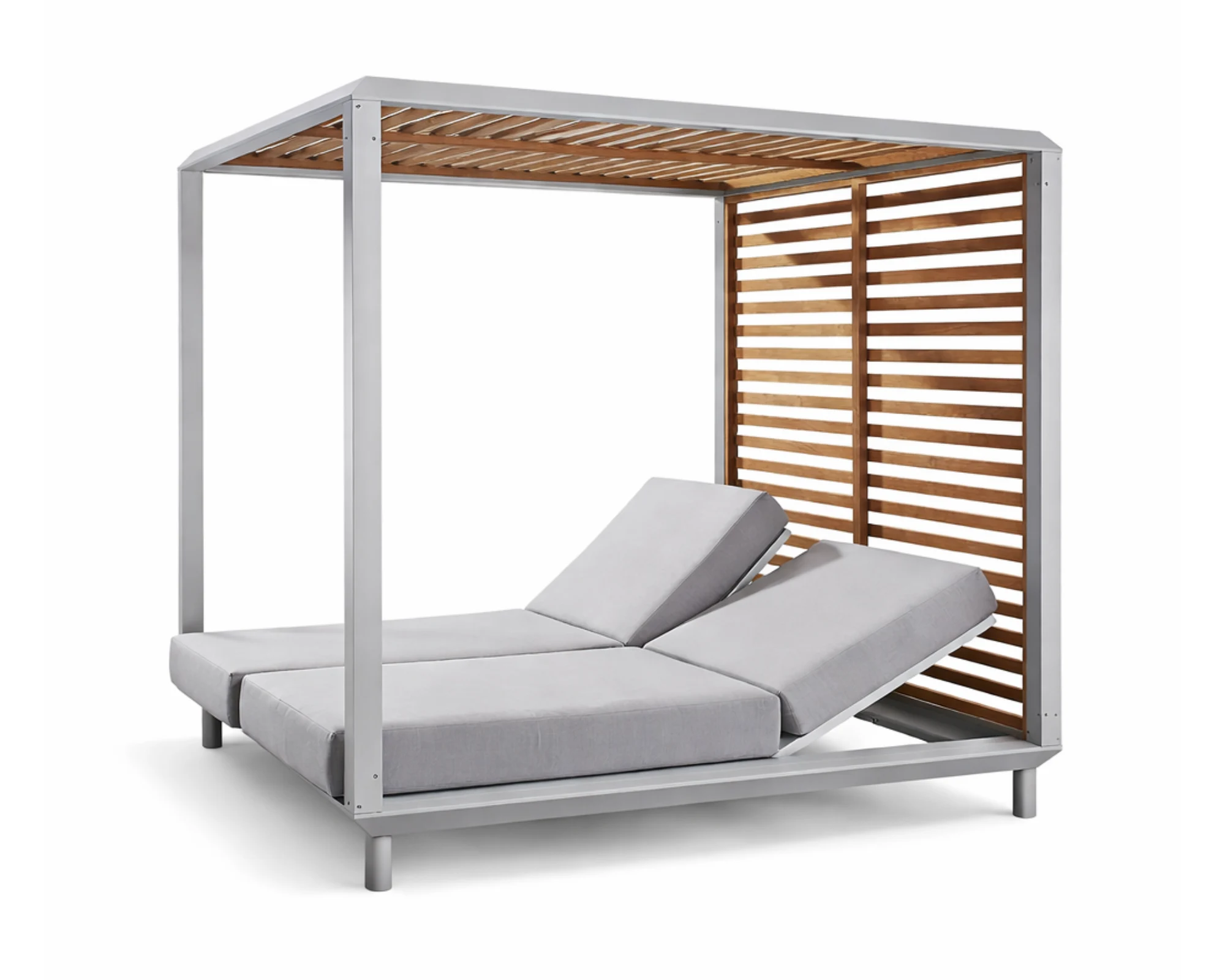 מסגרת המיטה משלבת בחירה בין אלומיניום לבין עץ טיק טבעי, ומדגישה מראה עכשווי עם נגיעה חומרית חמה. מעליה ניצב גג הצללה מעץ, אליו מצטרפים צדי וילון לבן היוצרים תחושת פרטיות נעימה ואווירה רגועה ומזמינה.