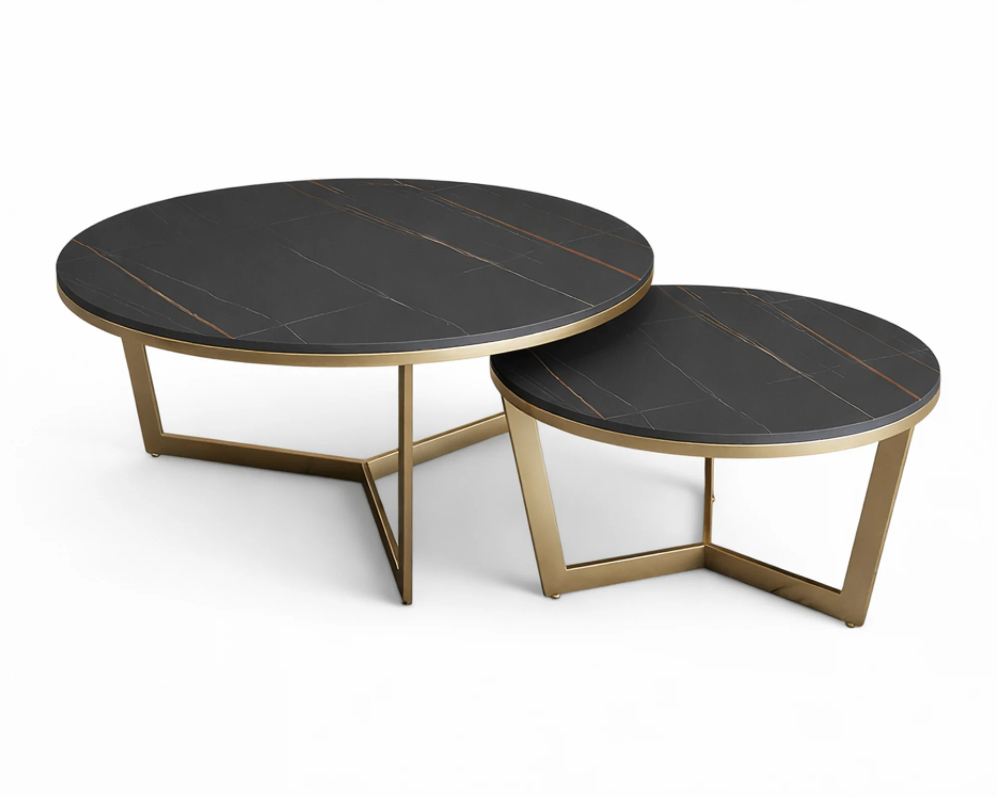 משטחי השולחנות עשויים שיש פורצלן יוקרתי בצבע שחור, המעניק עומק, דרמה ותחושת יוקרה גבוהה. רגלי הטיטניום בגוון זהב, בעיצוב מוקפד ובעובי מרשים, יוצרות קונטרסט ייחודי ומוסיפות לשולחנות מראה מודרני ובלתי שגרתי.