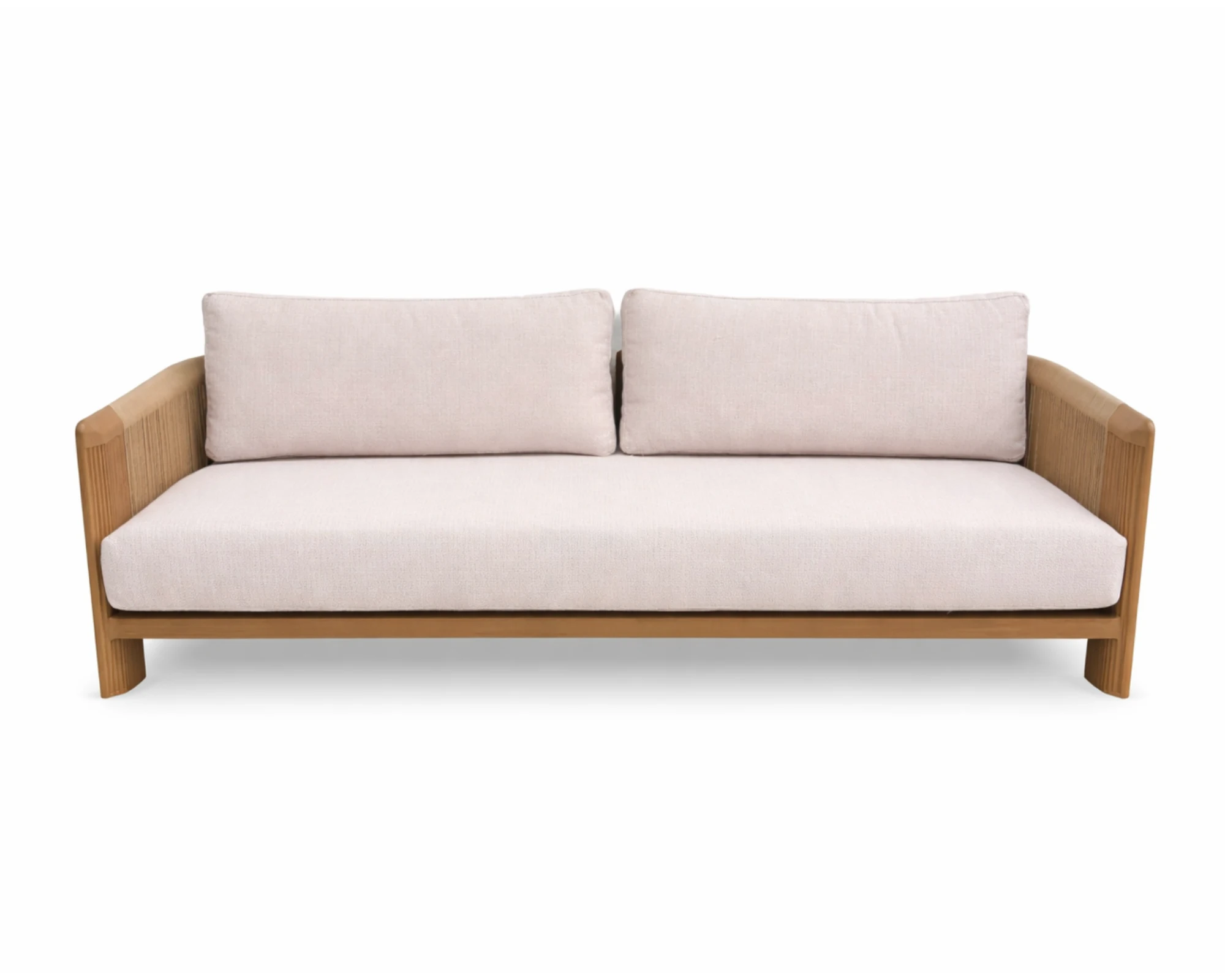 ספת חוץ עם מסגרת עץ וידיות מעוגלות מציגה מראה מאוזן ונקי, עם קווים רכים המשתלבים באופן טבעי במרחב החיצוני. הפרופורציות הרחבות והנמוכות מעניקות לה נוכחות שקטה ואלגנטית, תוך שמירה על תחושת פתיחות וזרימה.