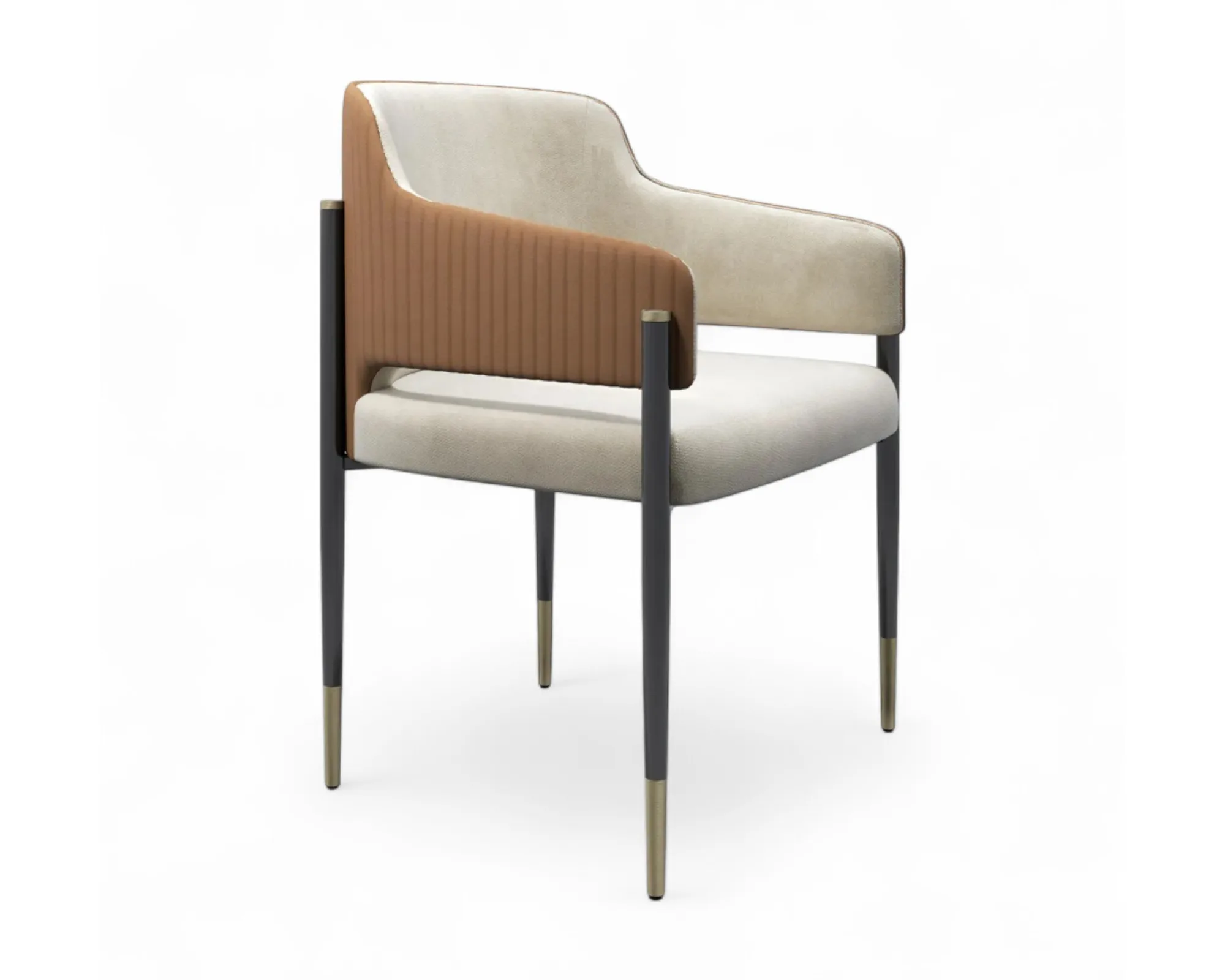 המושב והגב עשויים מבד משולב דמוי עור, המעניקים מראה יוקרתי ומלא סטייל. המסגרת הפנימית עשויה מפלטה מעוקלת, והספוג בצפיפות גבוהה, מה שמעניק לכיסא מראה יציב וחזק. הרגליים עשויות מברזל עטופות  בצבע זהב, מה שמעניק לכיסא מראה יוקרתי ועכשווי.